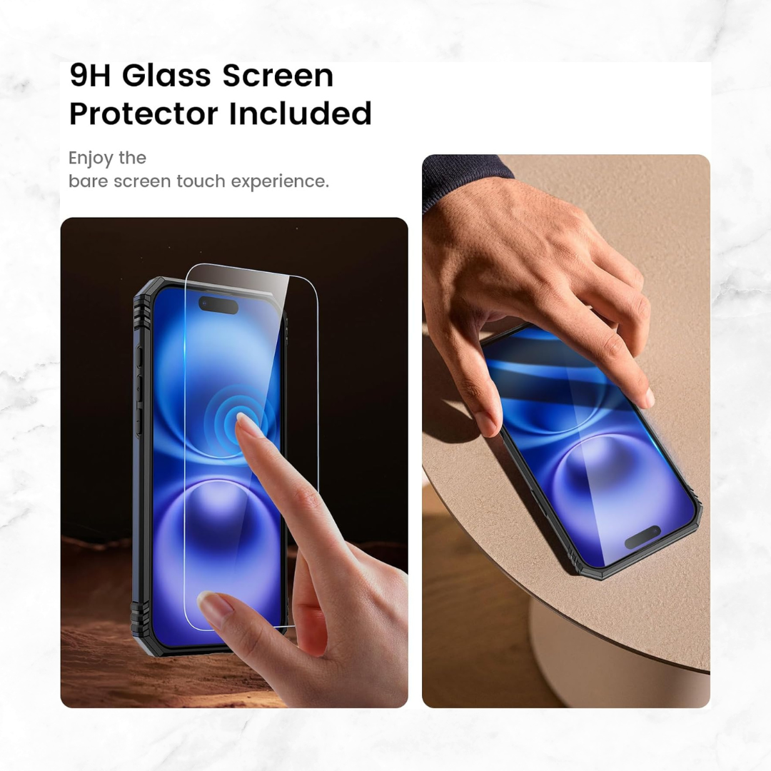 Level up your iPhone 16 protection with this all-in-one case! Featuring a sleek slide cover to protect your camera lens without extra attachments, a built-in tempered glass screen protector to shield against scratches and smudges, and rugged TPU + polycarbonate construction for maximum durability. Plus, enjoy hands-free viewing with the rotating kickstand and a secure ring for a comfortable, slip-free grip! Whether you're watching videos or texting, this case has you covered from every angle.