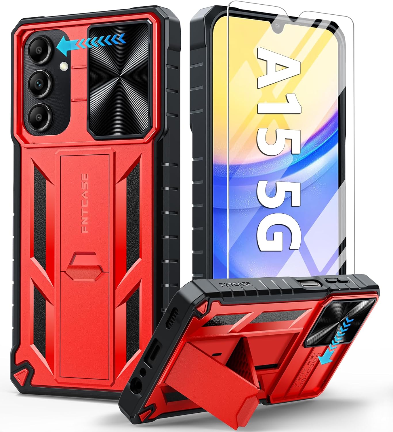 This Samsung Galaxy A15 5G case offers full-body protection with premium materials and practical features. Made from durable hard PC and flexible TPU, it includes a tempered glass screen protector to shield against scratches and impacts. The built-in airbags in all four corners provide excellent shock absorption, keeping your phone safe from drops. The unique sliding camera cover guards your lens from scratches and scuffs, while also helping to protect your privacy. A hidden foldable kickstand lets you enjoy hands-free viewing in both portrait and landscape modes—perfect for video calls, reading, or streaming movies. The tire-textured, non-slip design ensures a secure, comfortable grip, making it ideal for on-the-go activities. Designed specifically for the 6.5-inch Samsung Galaxy A15 5G, this case provides precise cutouts for easy access to all buttons and ports. With its rugged, military-grade construction, this case combines style, protection, and functionality for everyday use.