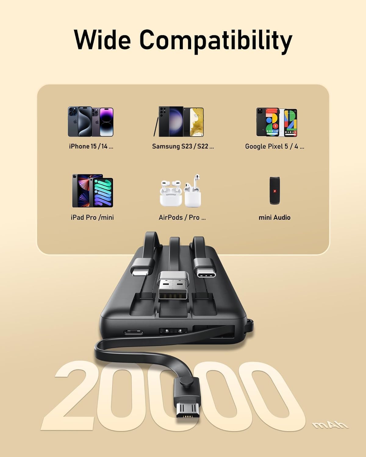 Veektomx 20000mAh 10000 mAh Portable Charger with Built-in Cables – Fast Charging Power Bank for iPhone, Samsung, and Android | Travel Essential USB-C Battery Pack